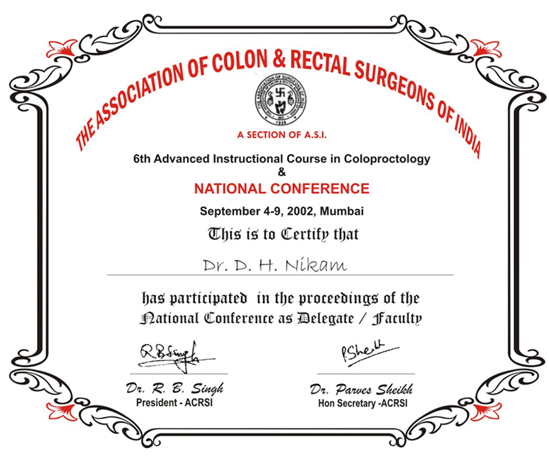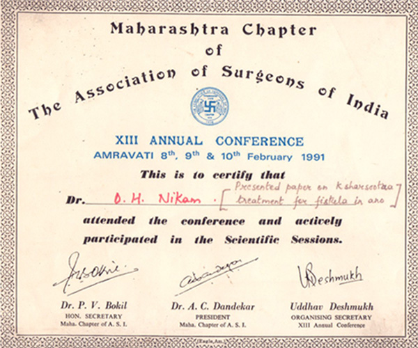 Done Paper Reading at ASIAN MEDICAL DOCTORS ASSOCIATION, Conference at K.M.C. Medical College. Manipal Karnatka University Feb 1992. Won prizes for Paper Reading on "Ayurvedic Treatment of Fistula in ano" in 9th Annual Surgeons Conference Maharashtra. Feb.91.
