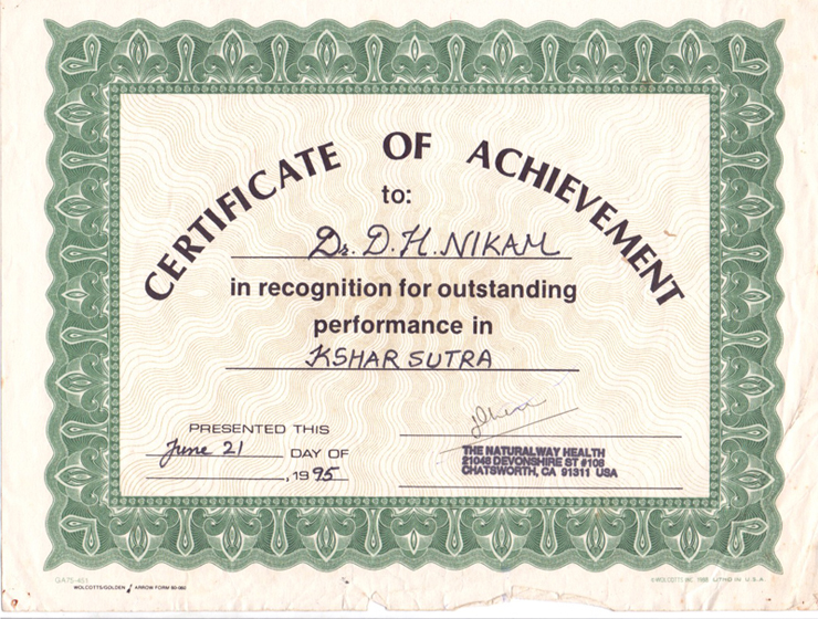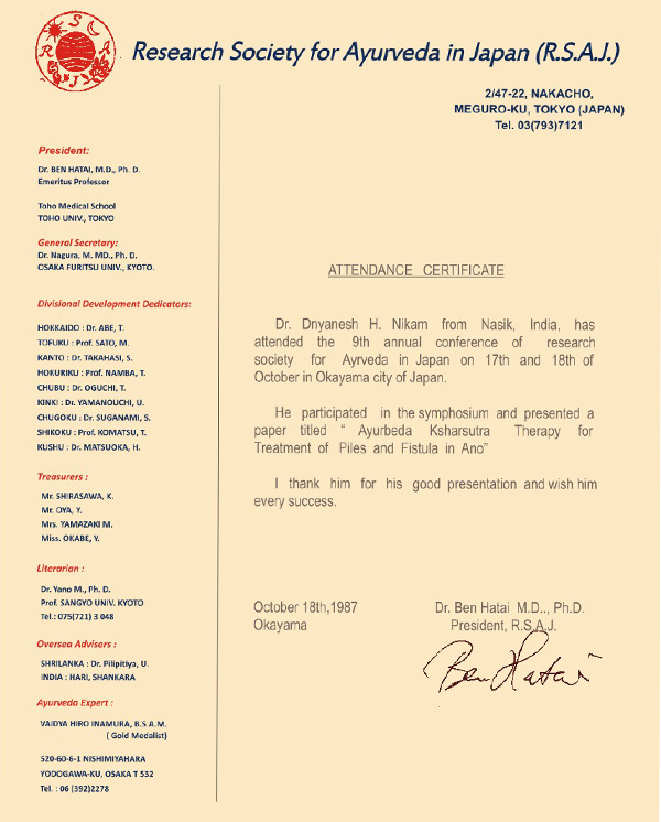 Paper Reading done before Research Society of Ayurveda in Japan at Okayama in 1987 on the Subject Ano Rectal Diseases and Ayurvedic treatment. Paper Reading done in All India Colo-Rectal Mid term Conference at Bombay Hospital in Sep 1991.