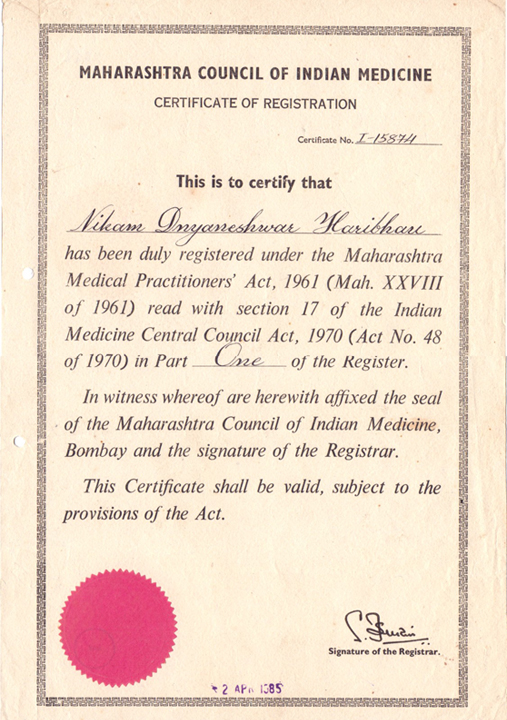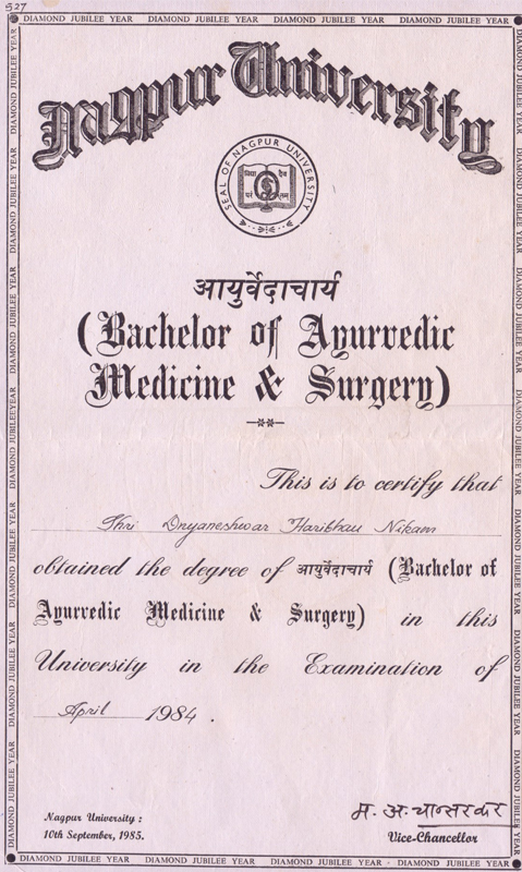 Honoured as B.A.M.S. (Ayurvedacharya) in 1984 from Nagpur University.
