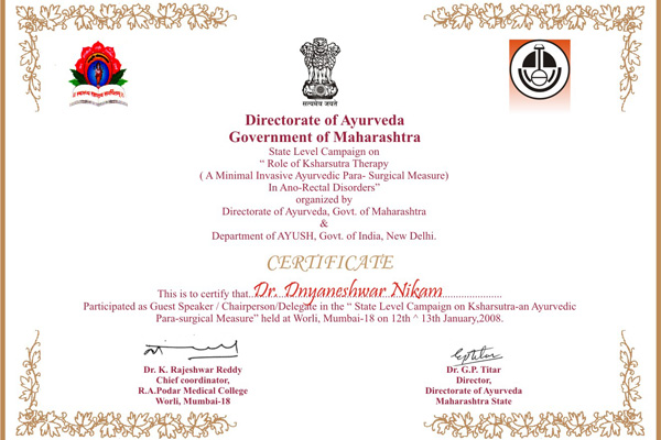 Dr. Dnyanesh Nikam is a well known doctor in Maharashtra for treating Ano-Rectal diseases like Piles, Fissures, Fistula, Ano Rectal Abscess, Pilonidal Sinus & Prolapse Rectum. A Bachelor of Ayurvedic Medicine & Surgery, Dr. Nikam has treated patients with para-surgical procedure, by using principles of Ayurveda (Indian science) & Modern science technology. He founded Sushrut Ano-Rectal Hospital & Research Centre. The hospital also serves as private training centre for doctors in Ano-Rectal diseases.