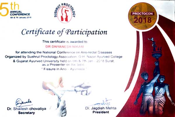 Delivered lecture as a Faculty Member in Sushrut Proctology Association, Surat Conference on Fissure in ano & Ayurvedic Treatment on 6th & 7th January 2018.