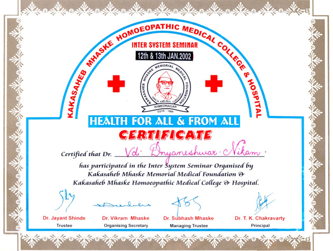 Felicitated by Maharashtra Health University Nasik for effective Paper Reading in Conference in year 20 January 2000.
