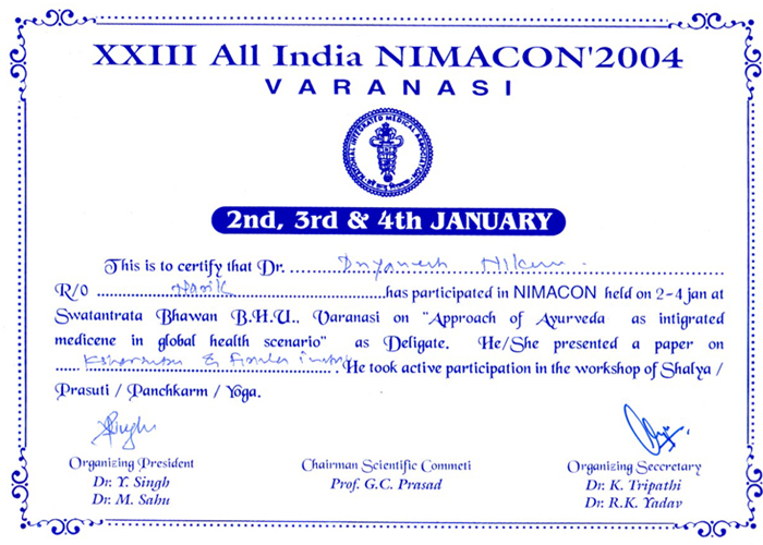Honoured as B.A.M.S. (Ayurvedacharya) in 1984 from Nagpur University.