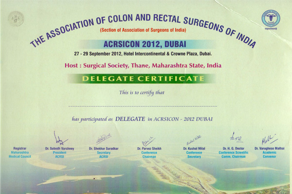 Done Paper Reading at ASIAN MEDICAL DOCTORS ASSOCIATION, Conference at K.M.C. Medical College. Manipal Karnatka University Feb 1992. Won prizes for Paper Reading on "Ayurvedic Treatment of Fistula in ano" in 9th Annual Surgeons Conference Maharashtra. Feb.91.